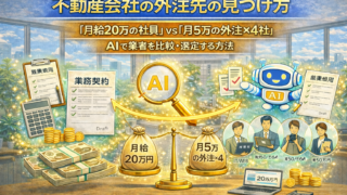 不動産会社の経営 不動産会社の外注先の見つけ方|「月給20万の社員」vs「月5万の外注×4社」AIで業者を比較・選定する方法 「月給20万の社員1人」と「月5万の外注×4社」どちらが利益が残るか? 年間124万円の差を具体的に比較。AIで見積書の「隠れたリスク」を自動検出するプロンプト付き。契約前の10項目チェックリストで失敗を防ぎます。 2026.02.10 不動産会社の経営